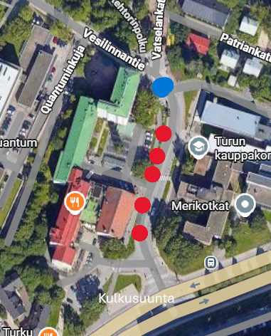 Ehdotan siis, että johonkin punaisten pisteiden keskikohtaan(liitteessä) tulisi myös merkki pysäköinnistä ja se olisi suunnattu yleiseen tulosuuntaan päin. Väitän että olisi asianmukaista, että liittämäni street view näkymästä tulisi jo ilmi miten pysäköidään.
