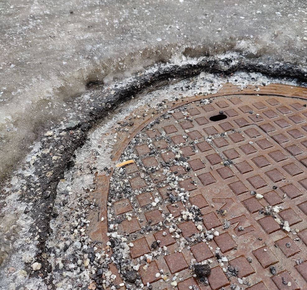 Viemärikaivon kansi painunut. Ainakin kahdessa paikkaa Lehmustie 20 ja Rakunatie 37 kohdalla.