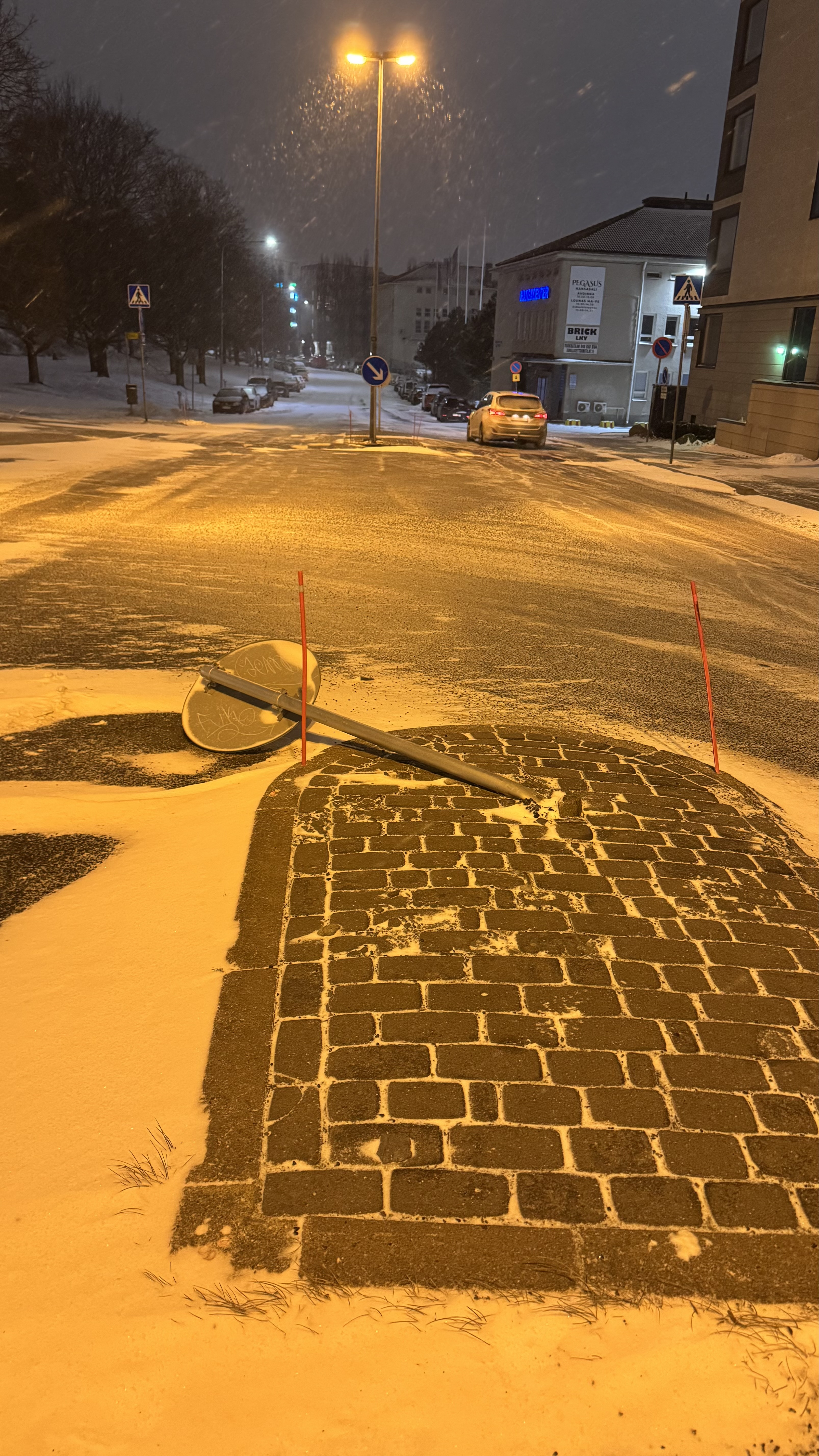 Puutarhakadun ja Hansakadun risteyksessä on kaatunut liikennemerkki