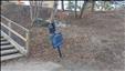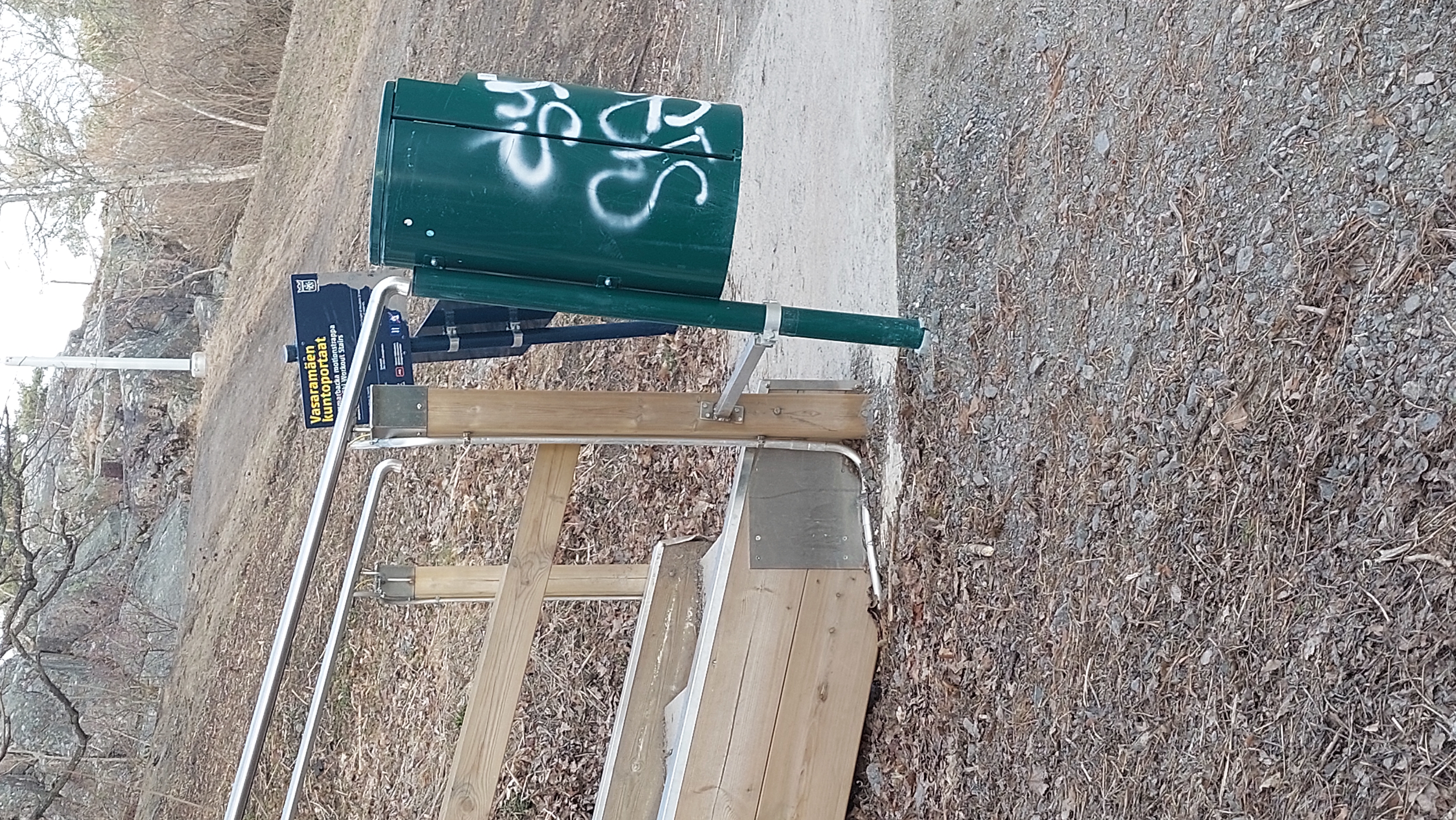 Turjanpuiston kuntoporatiden roskis ja kyltti ovat todella huonossa kunnossa. Luolavuoren kuntoportaiden kylttisysteemi olisi varmaan kestävämpi Turjanpuistossakin. Roskis kiinnitettiin alunperinkin vinoon.